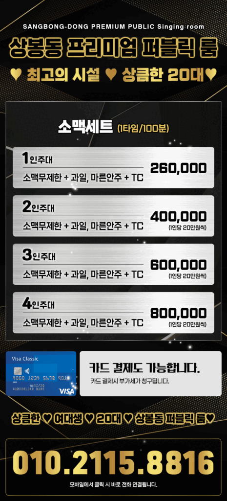 노래와 웃음이 넘치는 사당 퍼블릭에서의 밤은, 적당한 선만 지킨다면 오래도록 기억에 남을 유쾌한 추억을 선사할 것입니다. 상봉 지역 퍼블릭 가라오케를 찾고 계신다면 유마담을 찾아주세요. 연중무휴 당일예약도 가능합니다.상봉퍼블릭 무료픽업 다양한 이벤트 진행중. 010 2115 8816 예약문의 연락주시면 친절히 안내드리겠습니다.